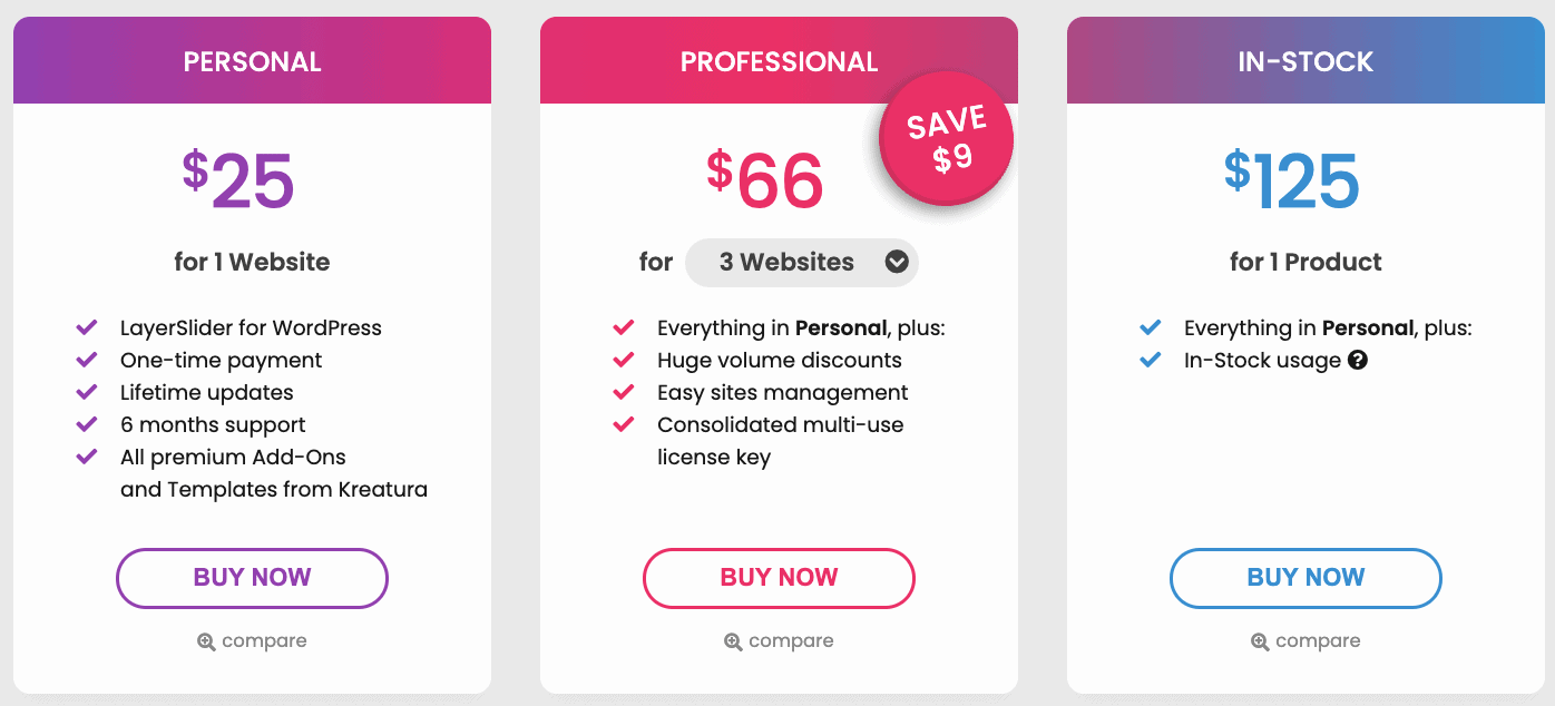 LayerSlider ist ausschließlich in einer kostenpflichtigen Variante erhältlich. So kannst du hier aus drei verschiedenen Paketen wählen. Die Lizenz “Personal” für eine Website kannst du hier zu einem Startpreis von 25 $ erwerben.