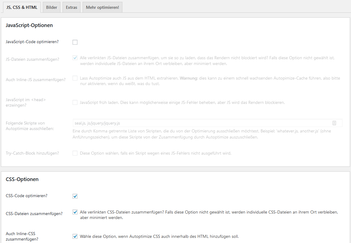 As soon as you have installed the plugin in WordPress, you will find various tabs such as “JS, CSS, HTML”, “Images” and “Extras” in the settings. The individual possibilities and options are very well described here and easy to understand, even for non-experts.