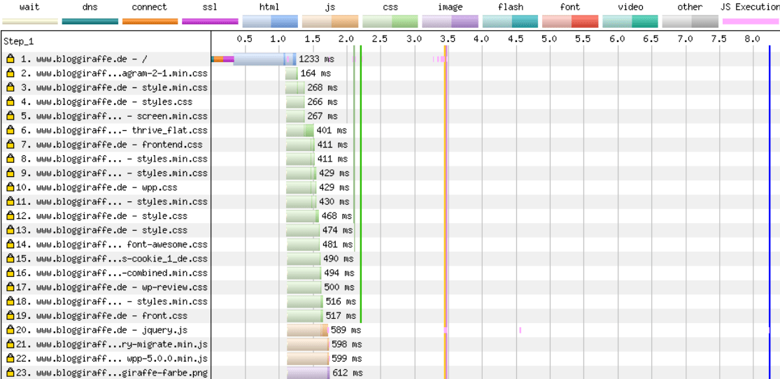 I would like to show you how reducing CSS can affect the loading time of your website using a waterfall diagram from my blog bloggiraffe.de. The examples are only small excerpts, but they clearly show how the loading time can be reduced.